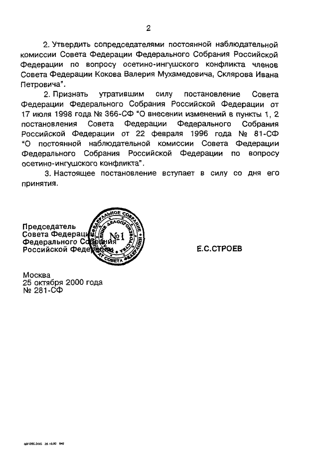 ПОСТАНОВЛЕНИЕ СФ ФС РФ от 25.10.2000 N 281-СФ