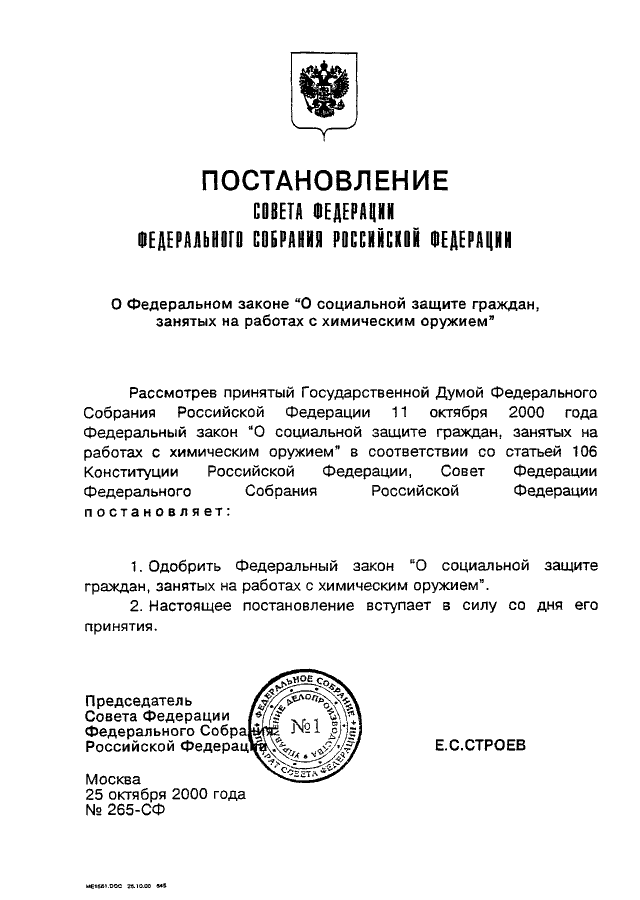 ПОСТАНОВЛЕНИЕ СФ ФС РФ от 25.10.2000 N 265-СФ