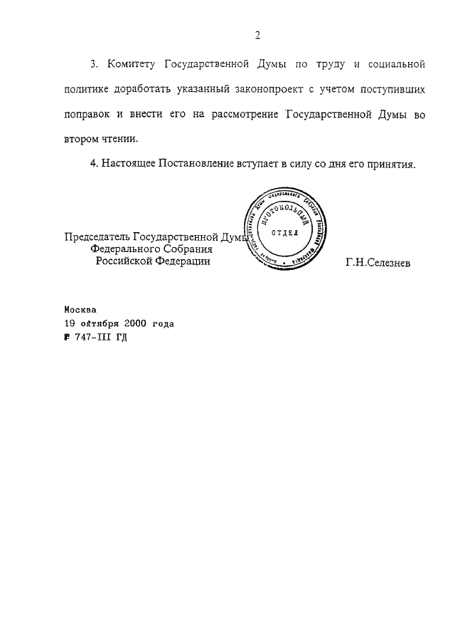 ПОСТАНОВЛЕНИЕ ГД ФС РФ от 19.10.2000 N 747-III ГД