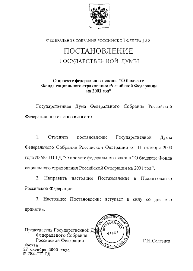 ПОСТАНОВЛЕНИЕ ГД ФС РФ от 27.10.2000 N 782-III ГД