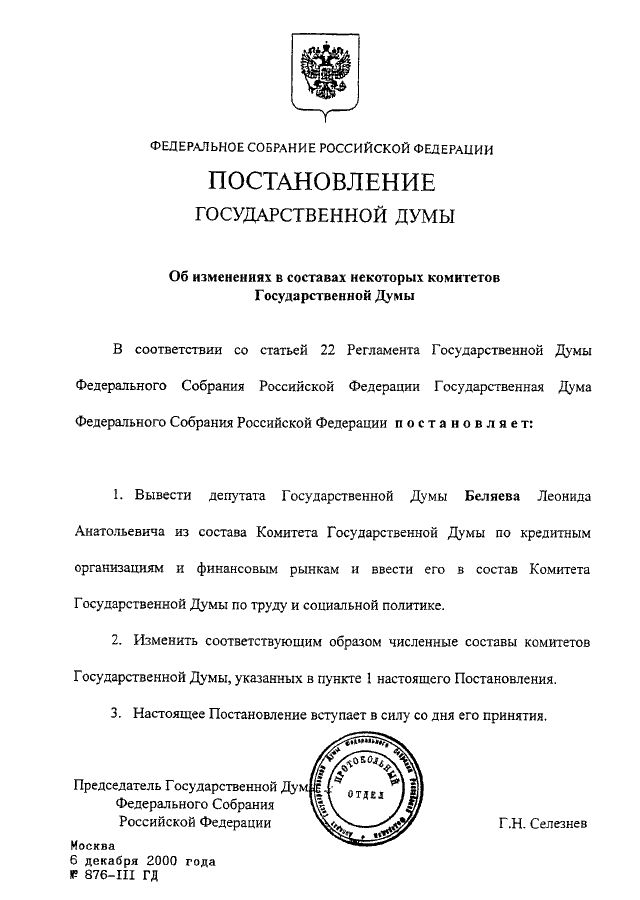 ПОСТАНОВЛЕНИЕ ГД ФС РФ от 06.12.2000 N 876-III ГД