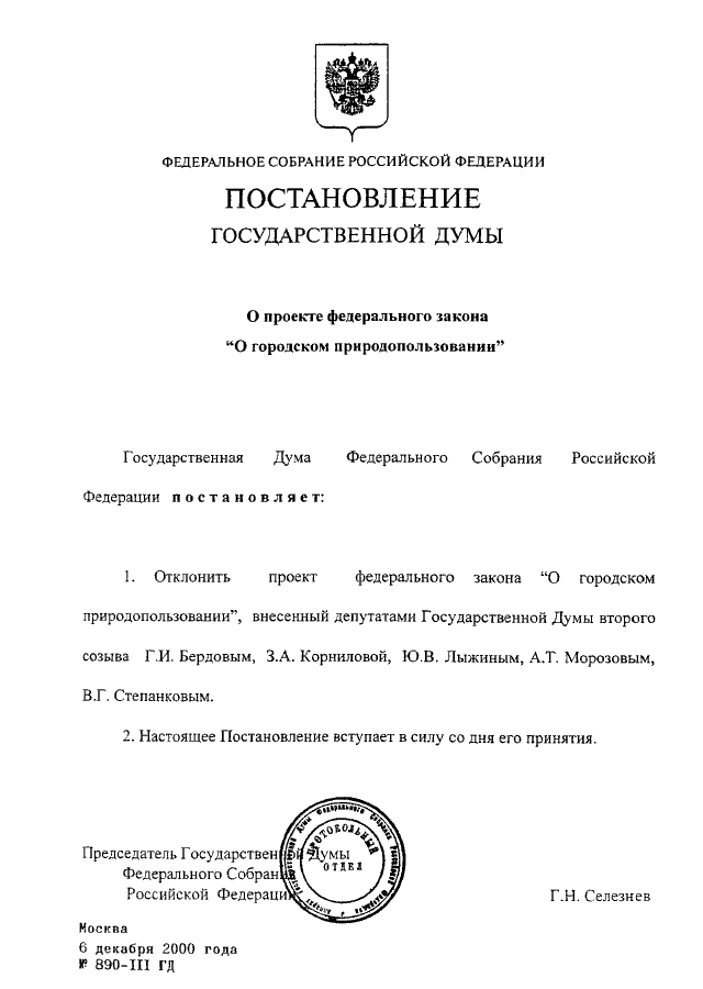 ПОСТАНОВЛЕНИЕ ГД ФС РФ от 06.12.2000 N 890-III ГД