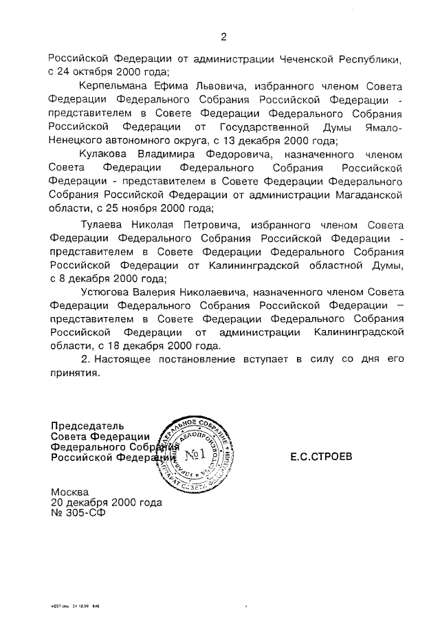 ПОСТАНОВЛЕНИЕ СФ ФС РФ от 20.12.2000 N 305-СФ