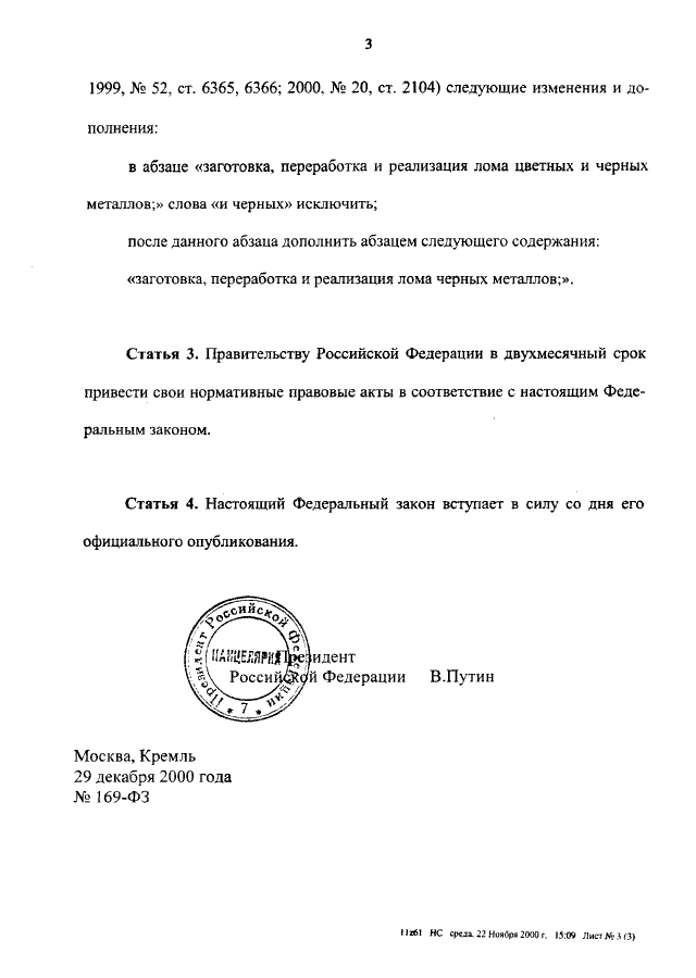 ФЕДЕРАЛЬНЫЙ ЗАКОН от 29.12.2000 N 169-ФЗ
