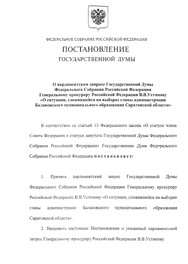 "О ПАРЛАМЕНТСКОМ ЗАПРОСЕ ГОСУДАРСТВЕННОЙ ДУМЫ ФЕДЕРАЛЬНОГО