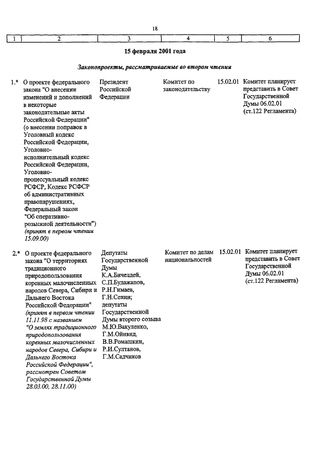 "О КАЛЕНДАРЕ РАССМОТРЕНИЯ ВОПРОСОВ ГОСУДАРСТВЕННОЙ ДУМОЙ С 7 ПО 22 ФЕВРАЛЯ 2001 ГОДА"