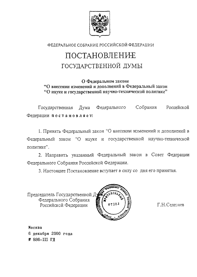 ПОСТАНОВЛЕНИЕ ГД ФС РФ от 06.12.2000 N 886-III ГД