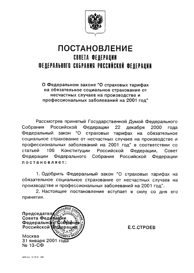 ПОСТАНОВЛЕНИЕ СФ ФС РФ от 31.01.2001 N 13-СФ