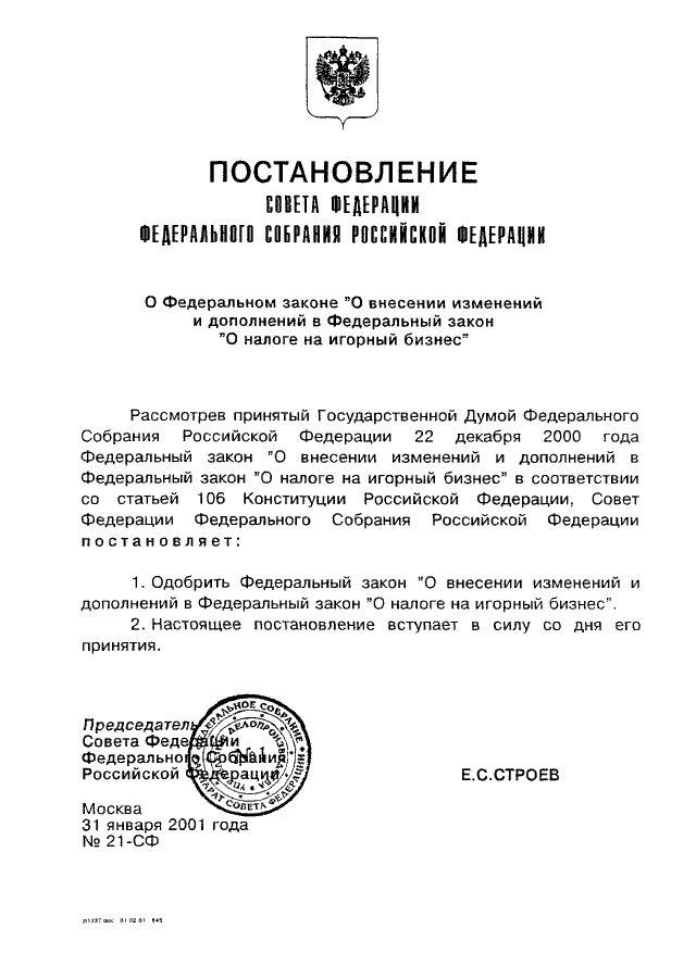 ПОСТАНОВЛЕНИЕ СФ ФС РФ от 31.01.2001 N 21-СФ