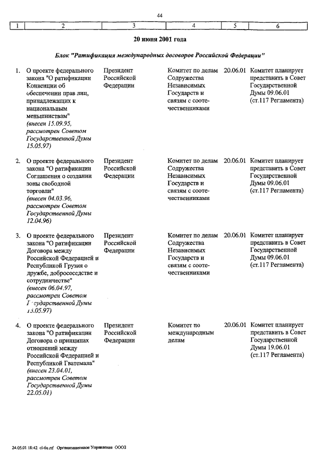 "О КАЛЕНДАРЕ РАССМОТРЕНИЯ ВОПРОСОВ ГОСУДАРСТВЕННОЙ ДУМОЙ С 6 ИЮНЯ ПО 5 ИЮЛЯ 2001 ГОДА"