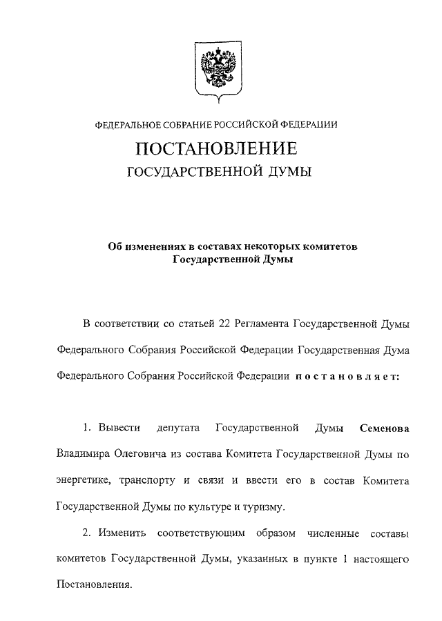 "ОБ ИЗМЕНЕНИЯХ В СОСТАВАХ НЕКОТОРЫХ КОМИТЕТОВ ГОСУДАРСТВЕННОЙ ДУМЫ"