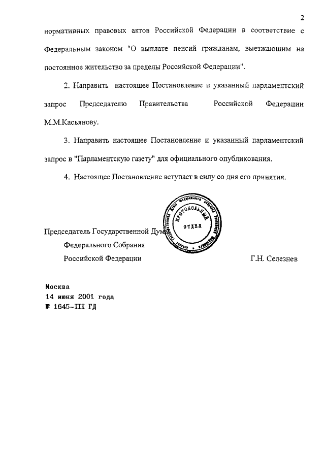 ПОСТАНОВЛЕНИЕ ГД ФС РФ от 14.06.2001 N 1645-III ГД