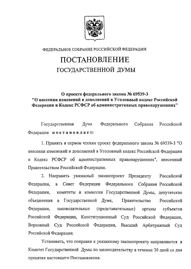"О ПРОЕКТЕ ФЕДЕРАЛЬНОГО ЗАКОНА N 69539-3 "О ВНЕСЕНИИ ИЗМЕНЕНИЙ И ДОПОЛНЕНИЙ В УГОЛОВНЫЙ КОДЕКС РОССИЙСКОЙ ФЕДЕРАЦИИ И КОДЕКС РСФСР ОБ АДМИНИСТРАТИВНЫХ ПРАВОНАРУШЕНИЯХ"