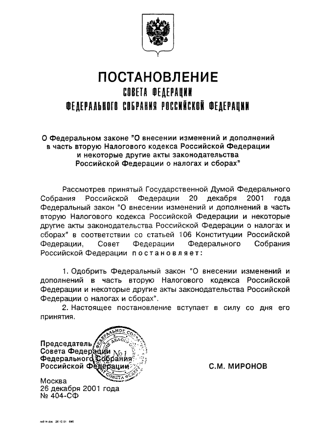 ПОСТАНОВЛЕНИЕ СФ ФС РФ от 26.12.2001 N 404-СФ
