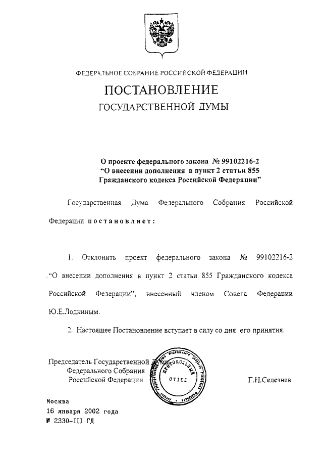 ПОСТАНОВЛЕНИЕ ГД ФС РФ от 16.01.2002 N 2330-III ГД