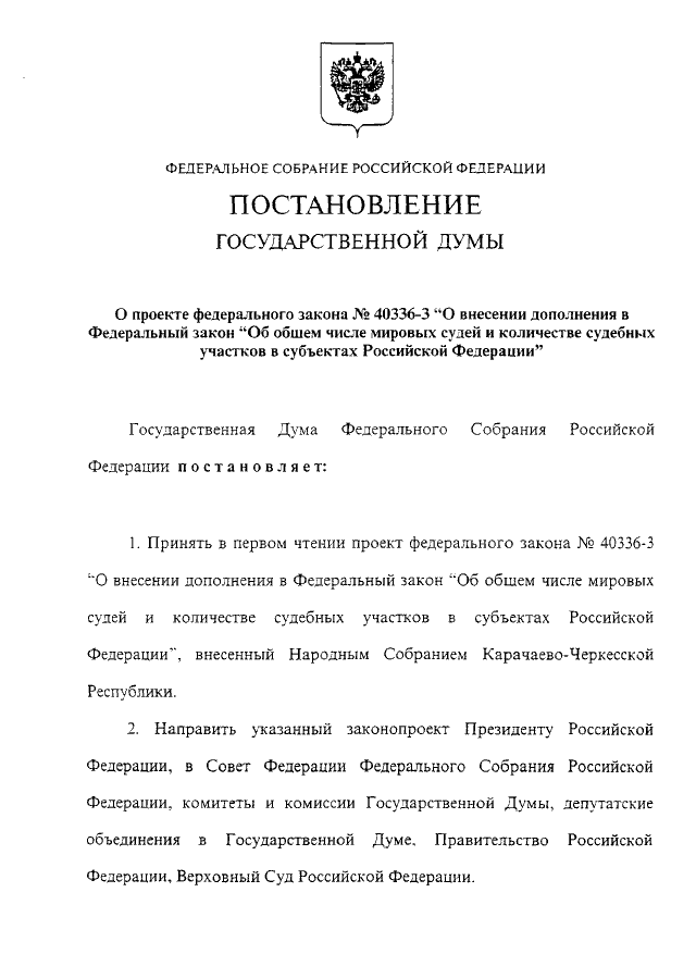 "О ПРОЕКТЕ ФЕДЕРАЛЬНОГО ЗАКОНА N 40336-3 "О ВНЕСЕНИИ ДОПОЛНЕНИЯ В ФЕДЕРАЛЬНЫЙ ЗАКОН "ОБ ОБЩЕМ ЧИСЛЕ МИРОВЫХ СУДЕЙ И КОЛИЧЕСТВЕ СУДЕБНЫХ УЧАСТКОВ В СУБЪЕКТАХ РОССИЙСКОЙ ФЕДЕРАЦИИ"