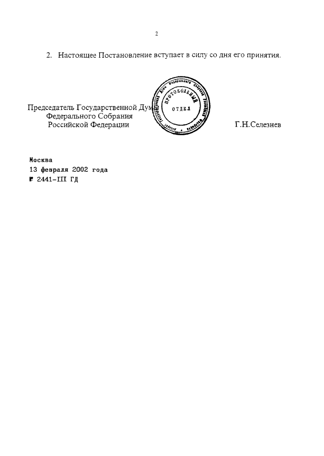 ПОСТАНОВЛЕНИЕ ГД ФС РФ от 13.02.2002 N 2441-III ГД