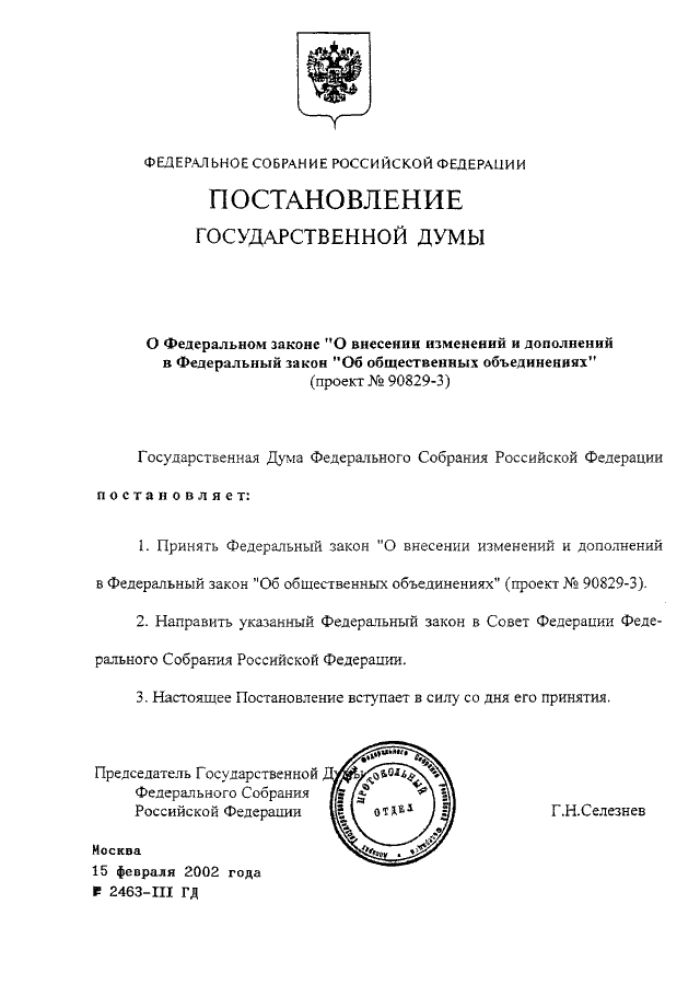 ПОСТАНОВЛЕНИЕ ГД ФС РФ от 15.02.2002 N 2463-III ГД