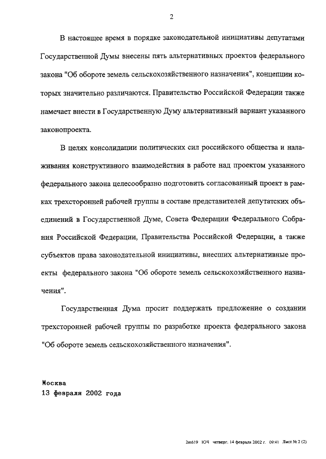 "ОБ ОБРАЩЕНИИ ГОСУДАРСТВЕННОЙ ДУМЫ ФЕДЕРАЛЬНОГО СОБРАНИЯ РОССИЙСКОЙ ФЕДЕРАЦИИ "К ПРЕЗИДЕНТУ РОССИЙСКОЙ ФЕДЕРАЦИИ В.В. ПУТИНУ, СОВЕТУ ФЕДЕРАЦИИ ФЕДЕРАЛЬНОГО СОБРАНИЯ РОССИЙСКОЙ ФЕДЕРАЦИИ И ПРАВИТЕЛЬСТВУ РОССИЙСКОЙ ФЕДЕРАЦИИ О СОЗДАНИИ СОВМЕСТНОЙ ТРЕХСТОРОННЕЙ РАБОЧЕЙ ГРУППЫ ПО РАЗРАБОТКЕ ПРОЕКТА ФЕДЕРАЛЬНОГО ЗАКОНА "ОБ ОБОРОТЕ ЗЕМЕЛЬ СЕЛЬСКОХОЗЯЙСТВЕННОГО НАЗНАЧЕНИЯ"