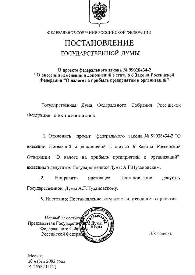 ПОСТАНОВЛЕНИЕ ГД ФС РФ от 20.03.2002 N 2558-III ГД