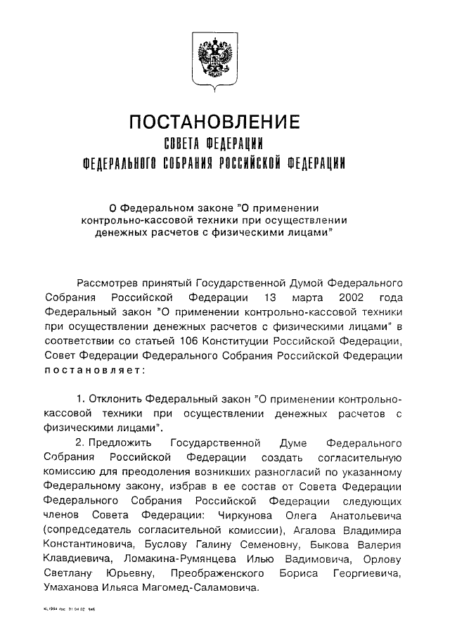 ПОСТАНОВЛЕНИЕ СФ ФС РФ от 29.03.2002 N 168-СФ