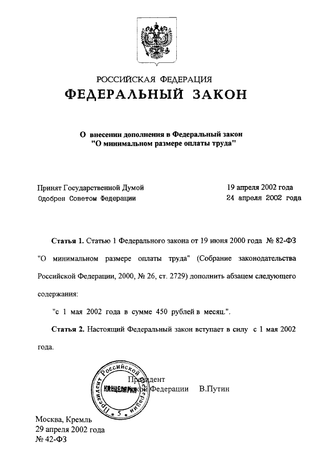 ФЕДЕРАЛЬНЫЙ ЗАКОН от 29.04.2002 N 42-ФЗ