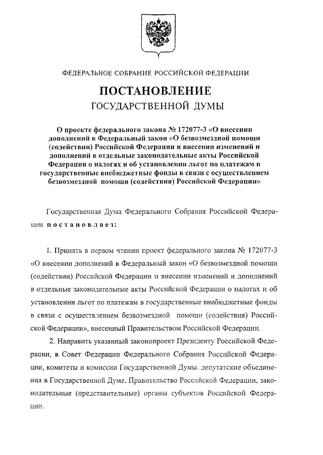 "О ПРОЕКТЕ ФЕДЕРАЛЬНОГО ЗАКОНА N 172077-3 "О ВНЕСЕНИИ ДОПОЛНЕНИЙ В