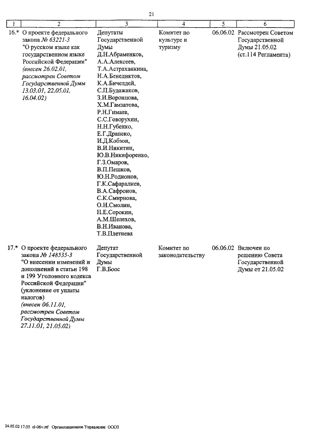 "О КАЛЕНДАРЕ РАССМОТРЕНИЯ ВОПРОСОВ ГОСУДАРСТВЕННОЙ ДУМОЙ С 5 ПО 28 ИЮНЯ 2002 ГОДА"