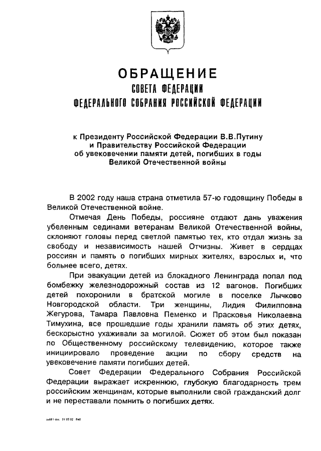 "К ПРЕЗИДЕНТУ РОССИЙСКОЙ ФЕДЕРАЦИИ В.В. ПУТИНУ И ПРАВИТЕЛЬСТВУ РОССИЙСКОЙ ФЕДЕРАЦИИ ОБ УВЕКОВЕЧЕНИИ ПАМЯТИ ДЕТЕЙ, ПОГИБШИХ В ГОДЫ ВЕЛИКОЙ ОТЕЧЕСТВЕННОЙ ВОЙНЫ"