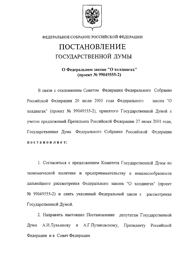 "О ФЕДЕРАЛЬНОМ ЗАКОНЕ "О ХОЛДИНГАХ" (ПРОЕКТ N 99049555-2)"