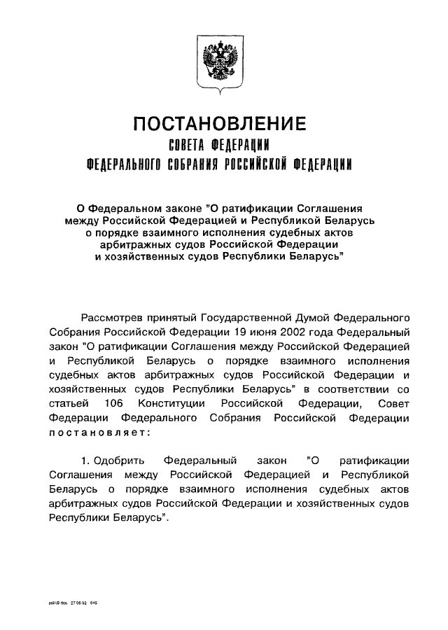 "О ФЕДЕРАЛЬНОМ ЗАКОНЕ "О РАТИФИКАЦИИ СОГЛАШЕНИЯ МЕЖДУ РОССИЙСКОЙ ФЕДЕРАЦИЕЙ И РЕСПУБЛИКОЙ БЕЛАРУСЬ О ПОРЯДКЕ ВЗАИМНОГО ИСПОЛНЕНИЯ СУДЕБНЫХ АКТОВ АРБИТРАЖНЫХ СУДОВ РОССИЙСКОЙ ФЕДЕРАЦИИ И ХОЗЯЙСТВЕННЫХ СУДОВ РЕСПУБЛИКИ БЕЛАРУСЬ"