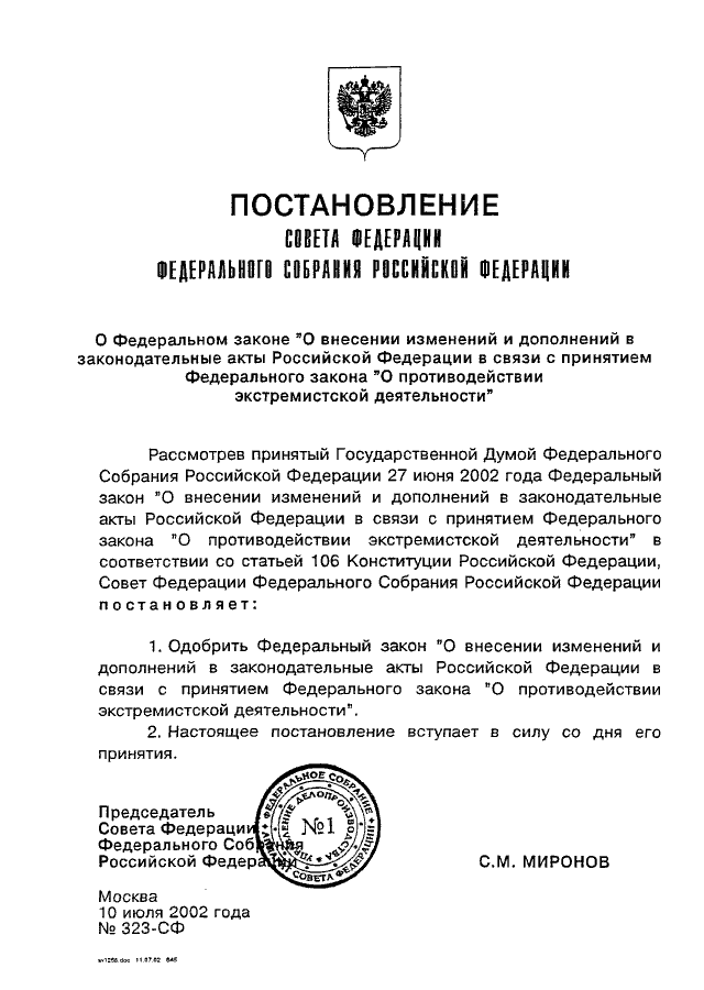ПОСТАНОВЛЕНИЕ СФ ФС РФ от 10.07.2002 N 323-СФ