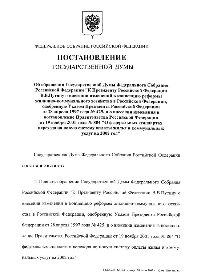 "ОБ ОБРАЩЕНИИ ГОСУДАРСТВЕННОЙ ДУМЫ ФЕДЕРАЛЬНОГО СОБРАНИЯ РОССИЙСКОЙ ФЕДЕРАЦИИ "К ПРЕЗИДЕНТУ РОССИЙСКОЙ ФЕДЕРАЦИИ В.В. ПУТИНУ О ВНЕСЕНИИ ИЗМЕНЕНИЙ В КОНЦЕПЦИЮ РЕФОРМЫ ЖИЛИЩНО - КОММУНАЛЬНОГО ХОЗЯЙСТВА В РОССИЙСКОЙ ФЕДЕРАЦИИ, ОДОБРЕННУЮ УКАЗОМ ПРЕЗИДЕНТА РОССИЙСКОЙ ФЕДЕРАЦИИ ОТ 28 АПРЕЛЯ 1997 Г. N 425, И О ВНЕСЕНИИ ИЗМЕНЕНИЯ В ПОСТАНОВЛЕНИЕ ПРАВИТЕЛЬСТВА РОССИЙСКОЙ ФЕДЕРАЦИИ ОТ 19 НОЯБРЯ 2001 Г. N 804 "О ФЕДЕРАЛЬНЫХ СТАНДАРТАХ ПЕРЕХОДА НА НОВУЮ СИСТЕМУ ОПЛАТЫ ЖИЛЬЯ И КОММУНАЛЬНЫХ УСЛУГ НА 2002 ГОД"