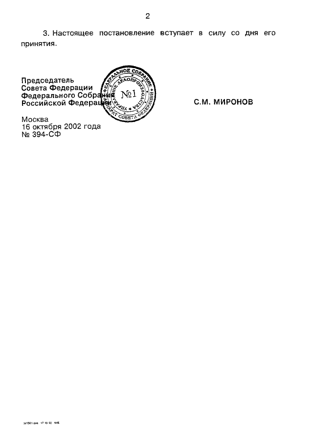 ПОСТАНОВЛЕНИЕ СФ ФС РФ от 16.10.2002 N 394-СФ
