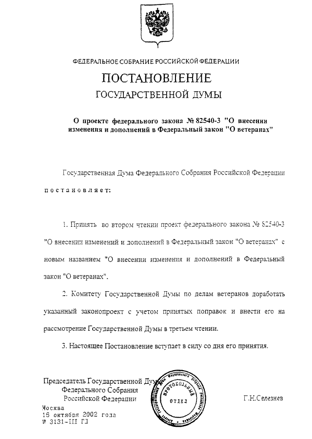 ПОСТАНОВЛЕНИЕ ГД ФС РФ от 16.10.2002 N 3131-III ГД