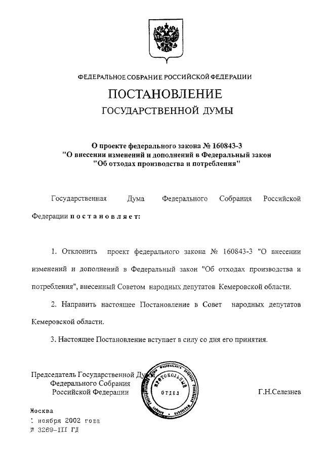 ПОСТАНОВЛЕНИЕ ГД ФС РФ от 01.11.2002 N 3269-III ГД