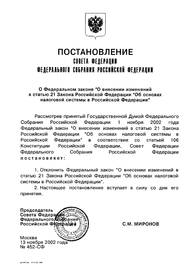ПОСТАНОВЛЕНИЕ СФ ФС РФ от 13.11.2002 N 452-СФ