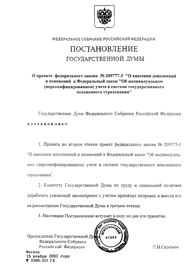 ПОСТАНОВЛЕНИЕ ГД ФС РФ от 15.11.2002 N 3306-III ГД