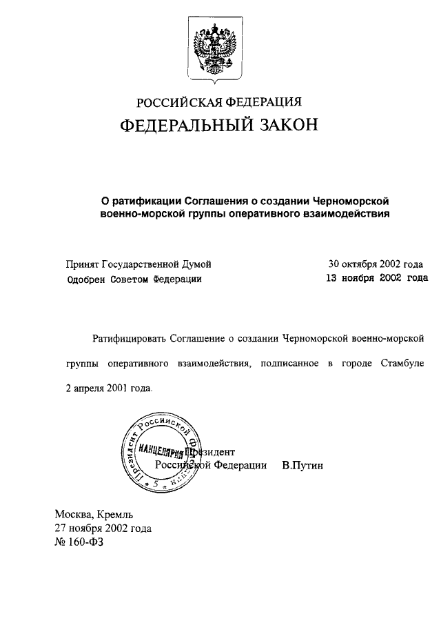 ФЕДЕРАЛЬНЫЙ ЗАКОН от 27.11.2002 N 160-ФЗ