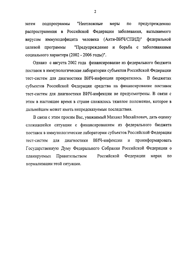 "О ПАРЛАМЕНТСКОМ ЗАПРОСЕ ГОСУДАРСТВЕННОЙ ДУМЫ ФЕДЕРАЛЬНОГО СОБРАНИЯ РОССИЙСКОЙ ФЕДЕРАЦИИ ПРЕДСЕДАТЕЛЮ ПРАВИТЕЛЬСТВА РОССИЙСКОЙ ФЕДЕРАЦИИ М.М. КАСЬЯНОВУ "О СИТУАЦИИ С ФИНАНСИРОВАНИЕМ ИЗ ФЕДЕРАЛЬНОГО БЮДЖЕТА ПОСТАВОК В ИММУНОЛОГИЧЕСКИЕ ЛАБОРАТОРИИ СУБЪЕКТОВ РОССИЙСКОЙ ФЕДЕРАЦИИ ТЕСТ - СИСТЕМ ДЛЯ ДИАГНОСТИКИ ВИЧ - ИНФЕКЦИИ"