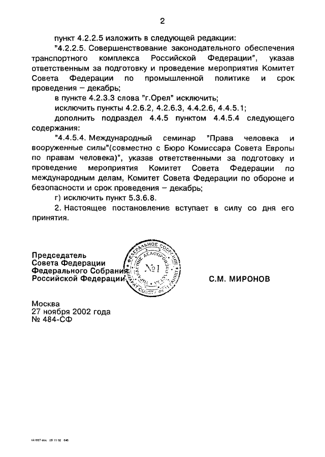 ПОСТАНОВЛЕНИЕ СФ ФС РФ от 27.11.2002 N 484-СФ
