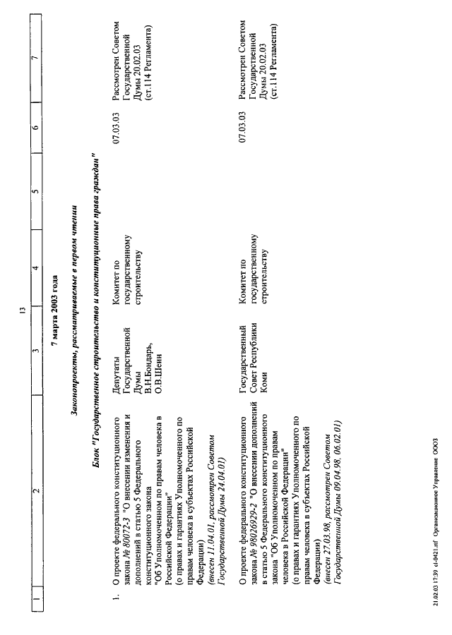 "О КАЛЕНДАРЕ РАССМОТРЕНИЯ ВОПРОСОВ ГОСУДАРСТВЕННОЙ ДУМОЙ С 5 ПО 21 МАРТА 2003 ГОДА"