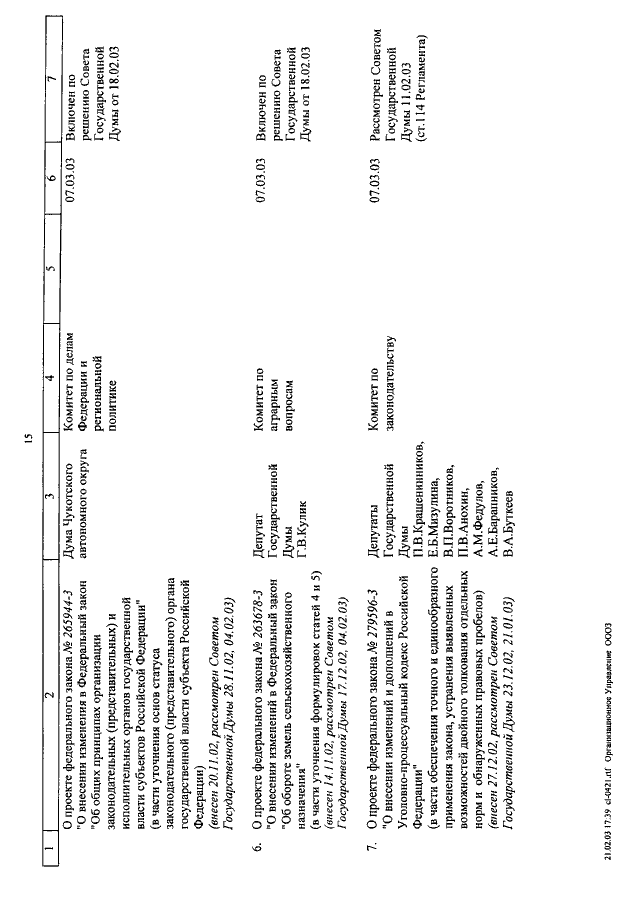 "О КАЛЕНДАРЕ РАССМОТРЕНИЯ ВОПРОСОВ ГОСУДАРСТВЕННОЙ ДУМОЙ С 5 ПО 21 МАРТА 2003 ГОДА"