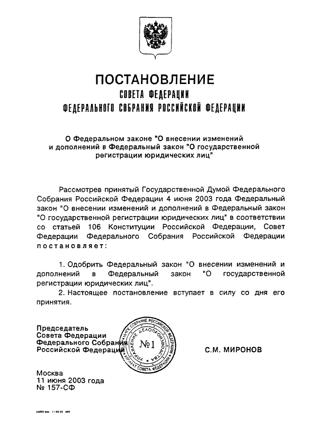ПОСТАНОВЛЕНИЕ СФ ФС РФ от 11.06.2003 N 157-СФ