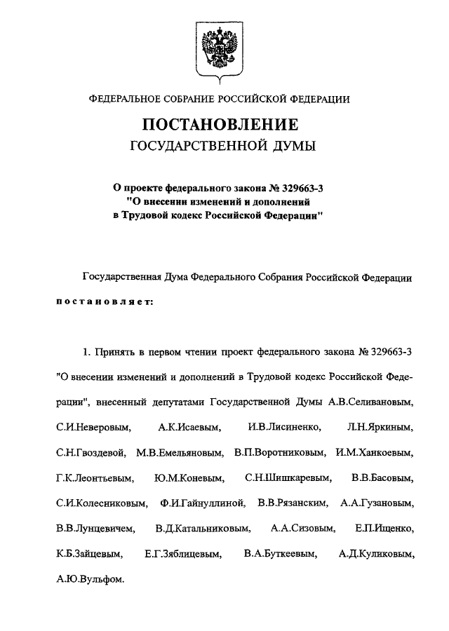 "О ПРОЕКТЕ ФЕДЕРАЛЬНОГО ЗАКОНА N 329663-3 "О ВНЕСЕНИИ ИЗМЕНЕНИЙ И ДОПОЛНЕНИЙ В ТРУДОВОЙ КОДЕКС РОССИЙСКОЙ ФЕДЕРАЦИИ"