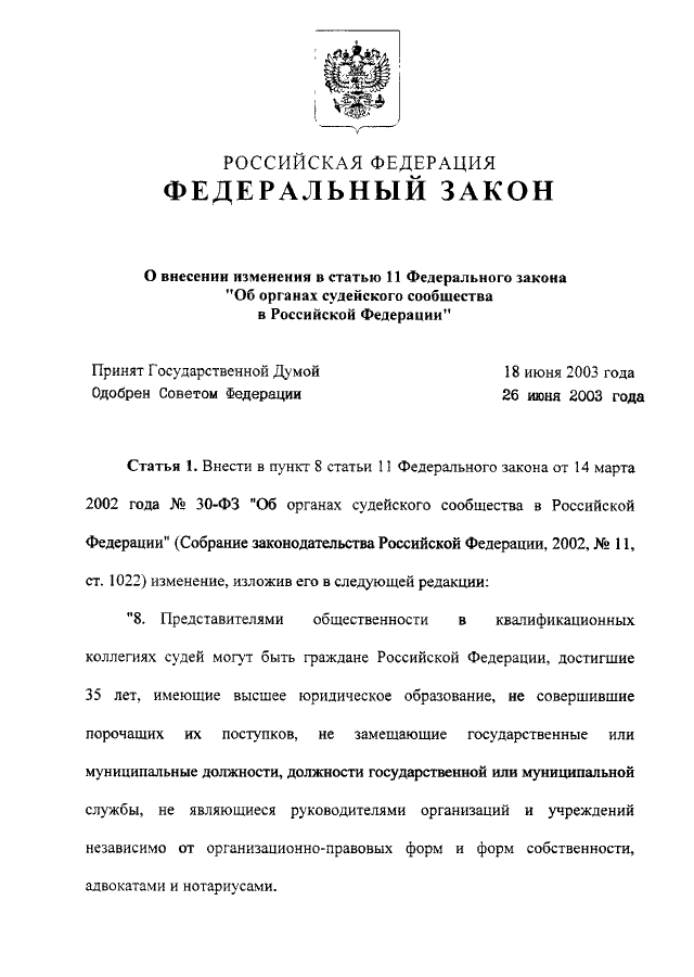 "О ВНЕСЕНИИ ИЗМЕНЕНИЯ В СТАТЬЮ 11 ФЕДЕРАЛЬНОГО ЗАКОНА "ОБ ОРГАНАХ СУДЕЙСКОГО СООБЩЕСТВА В РОССИЙСКОЙ ФЕДЕРАЦИИ"
