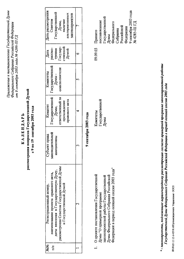 "О КАЛЕНДАРЕ РАССМОТРЕНИЯ ВОПРОСОВ ГОСУДАРСТВЕННОЙ ДУМОЙ С 9 ПО 19 СЕНТЯБРЯ 2003 ГОДА"