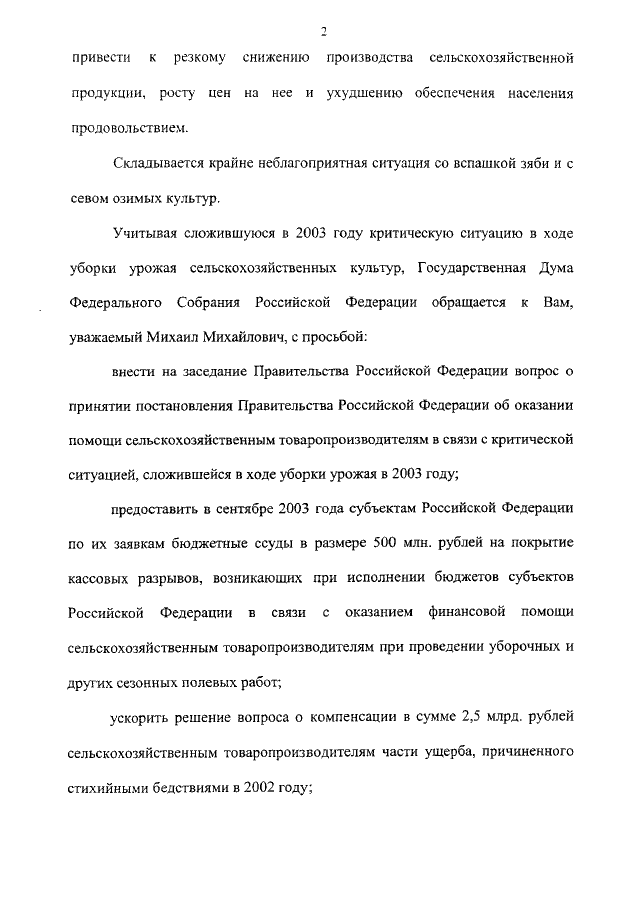 "ОБ ОБРАЩЕНИИ ГОСУДАРСТВЕННОЙ ДУМЫ ФЕДЕРАЛЬНОГО СОБРАНИЯ РОССИЙСКОЙ ФЕДЕРАЦИИ "К ПРЕДСЕДАТЕЛЮ ПРАВИТЕЛЬСТВА РОССИЙСКОЙ ФЕДЕРАЦИИ М.М. КАСЬЯНОВУ ОБ ОКАЗАНИИ ПОМОЩИ СЕЛЬСКОХОЗЯЙСТВЕННЫМ ТОВАРОПРОИЗВОДИТЕЛЯМ В СВЯЗИ С КРИТИЧЕСКОЙ СИТУАЦИЕЙ, СЛОЖИВШЕЙСЯ В ХОДЕ УБОРКИ УРОЖАЯ В 2003 ГОДУ"