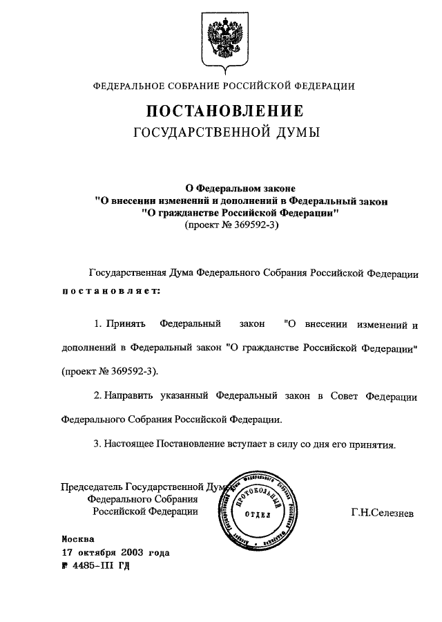 ПОСТАНОВЛЕНИЕ ГД ФС РФ от 17.10.2003 N 4485-III ГД
