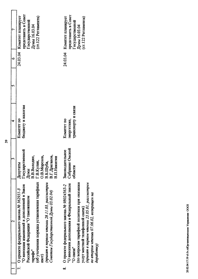 "О КАЛЕНДАРЕ РАССМОТРЕНИЯ ВОПРОСОВ ГОСУДАРСТВЕННОЙ ДУМОЙ С 3 ПО 31 МАРТА 2004"
